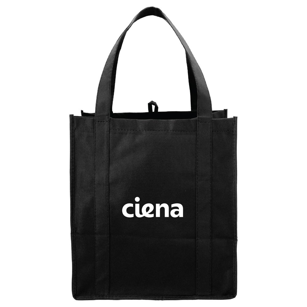 With its sturdy, reusable design, the Hercules Non-Woven Grocery Tote offers a sustainable alternative to plastic grocery bags. It has lightweight polypropylene construction, features durable 18.5" reinforced handles, and contains a supportive bottom board for added durability. Its spacious open main compartment is ideal for carrying groceries or personal items, such as books, clothing, and electronics.