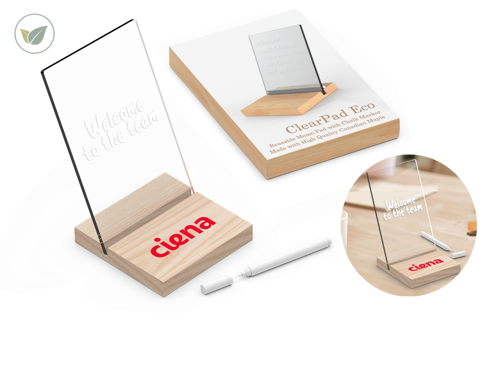 The ClearPad Eco is a fun desktop product to doodle, take notes or display an inspirational quote. Use the supplied white, chalk marker to write on the clear acrylic pad and then it can easily be wiped clean with a tissue or cloth. Endlessly reusable!