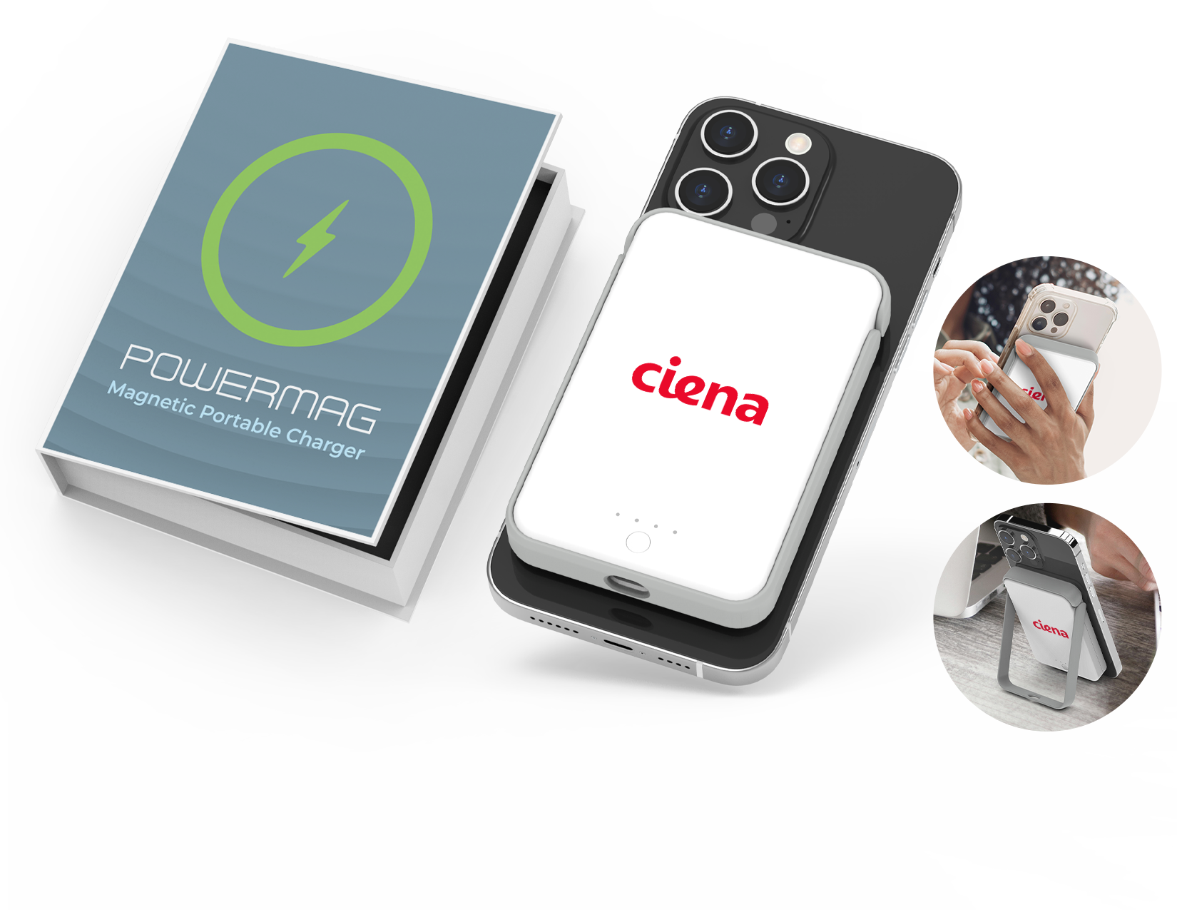 Perfect for on-the-go charging, PowerMag is a MagSafe® compatible wireless charger that magnetically connects to the back of your phone or MagSafe®case. The 5,000 mAh battery will provide most phones with hours of additional battery life without the need for extra cables. The unique flip-out kickstand can be used to prop your phone at a comfortable angle for hands-free viewing. With a variety of charging options, PowerMag can be used with any phone.