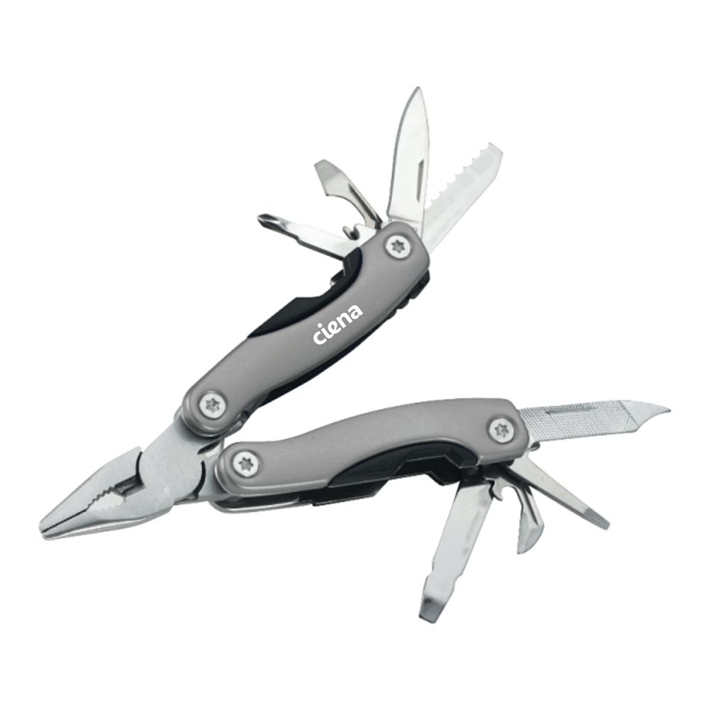 Functions include pliers, knife blade, Phillips-head screwdriver, flat-head screwdriver (small and large), bottle opener, can opener, saw blade and nail file. Includes nylon storage pouch with belt loop. Imprint available on multi-tool only.