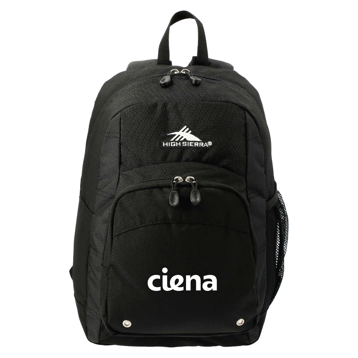 Constructed from a durable blend of nylon and Duralite, the High Sierra Impact Backpack features a spacious front-loading main compartment. It also includes a large gusseted front pocket for additional accessories, a cell phone pocket, and a mesh water bottle pocket, plus a handy organizer with pen pockets and a key fob. The backpack has contoured, padded shoulder straps and a cushioned back panel for comfortable wear, along with a grab-handle for carrying.