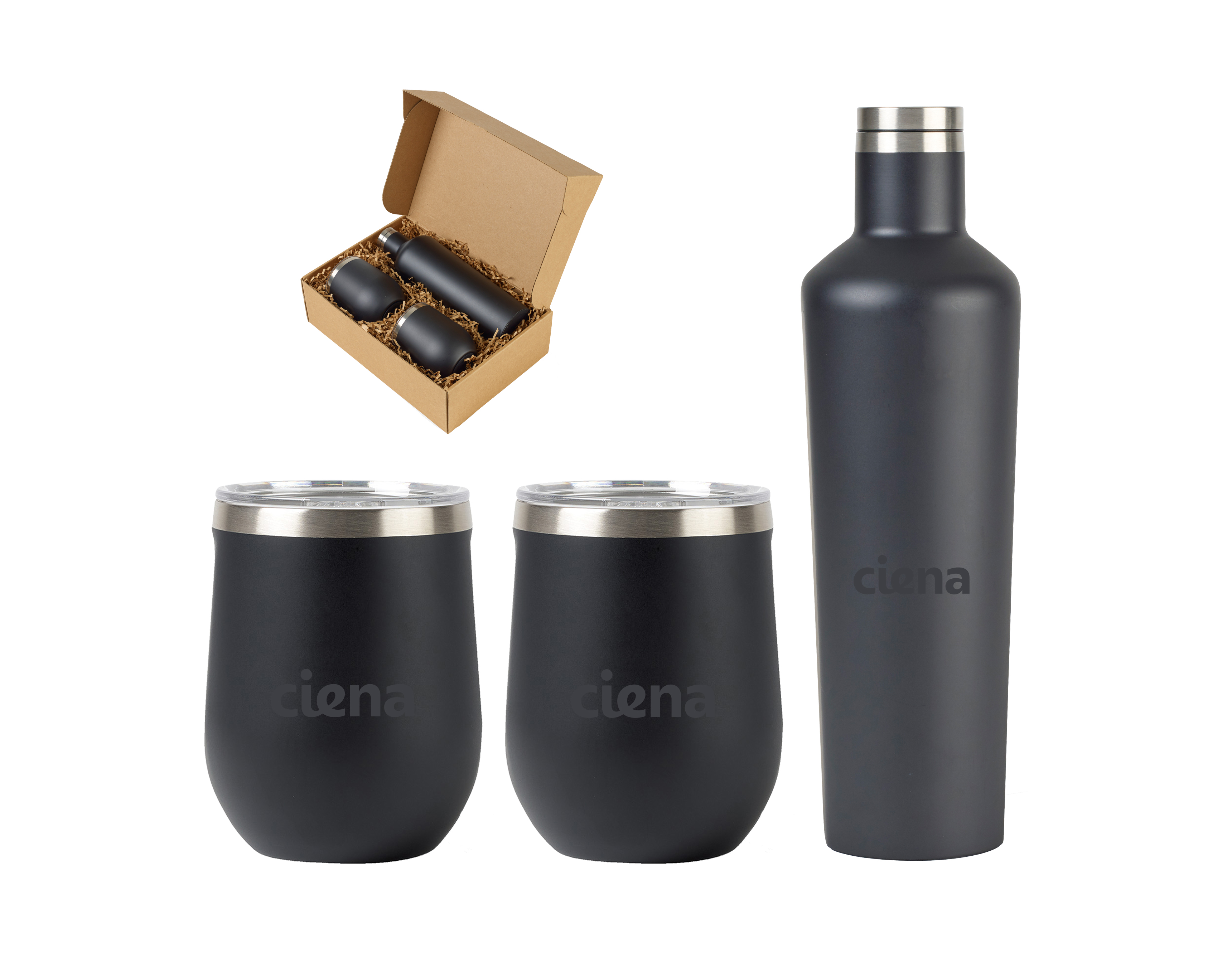 This gift set includes two (2) 12 oz. Corkcicle® Stemless Wine Cups and one (1) 25 oz. Corkcicle® Canteen.