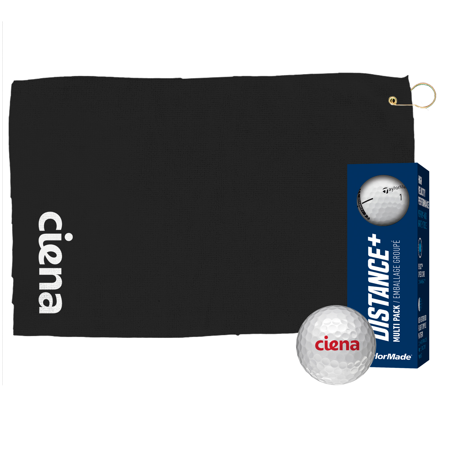 Kit includes three TaylorMade Distance Plus golf balls and a 24" x15" microfiber golf towels.