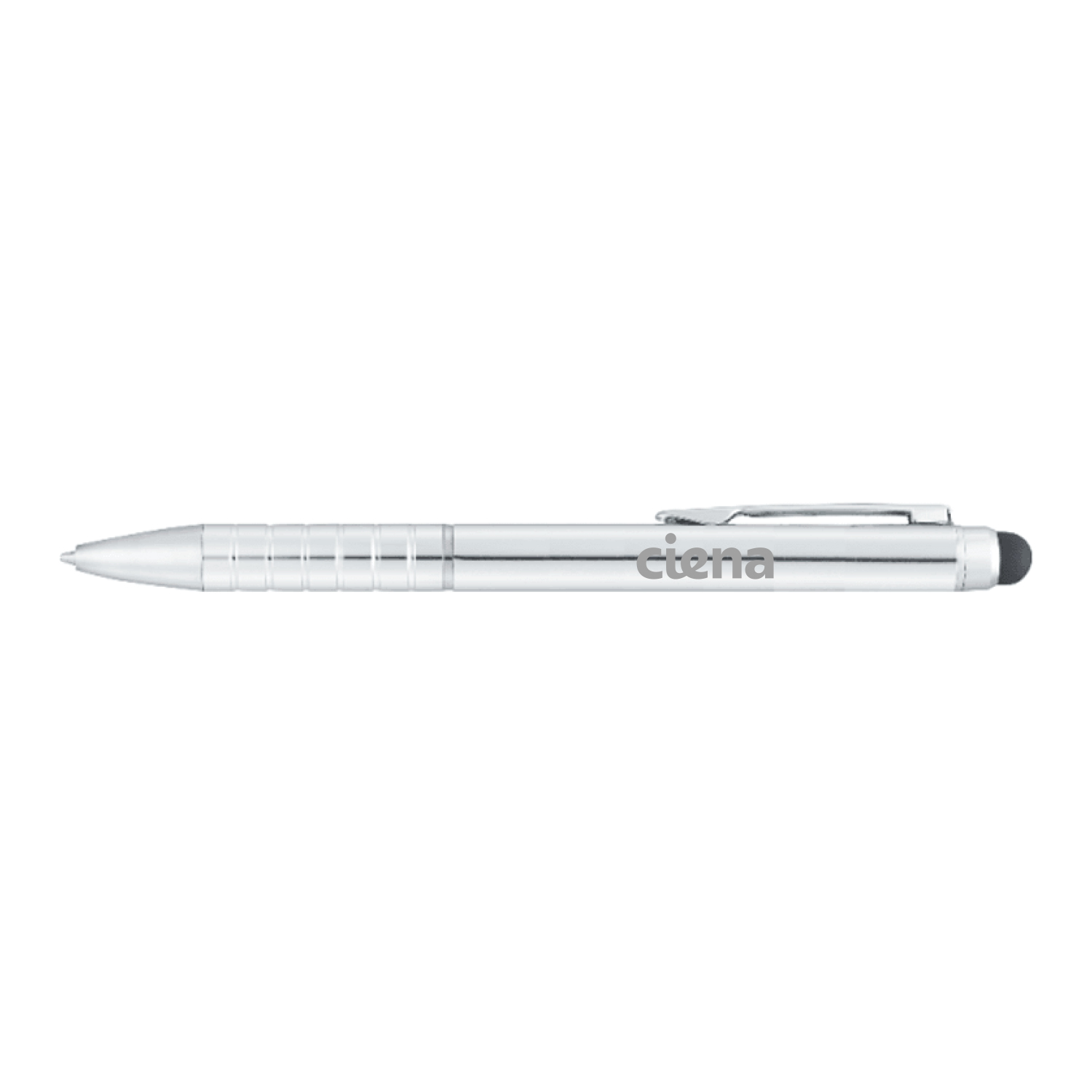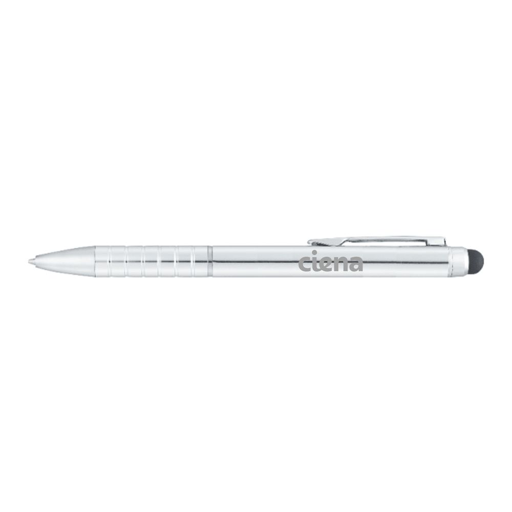 The Preston Dual Ballpoint Stylus combines a classic ballpoint silhouette with the added stylus function. Grip is artfully textured with chrome rings. Retractable twist action mechanism with standard blue ballpoint ink cartridge.