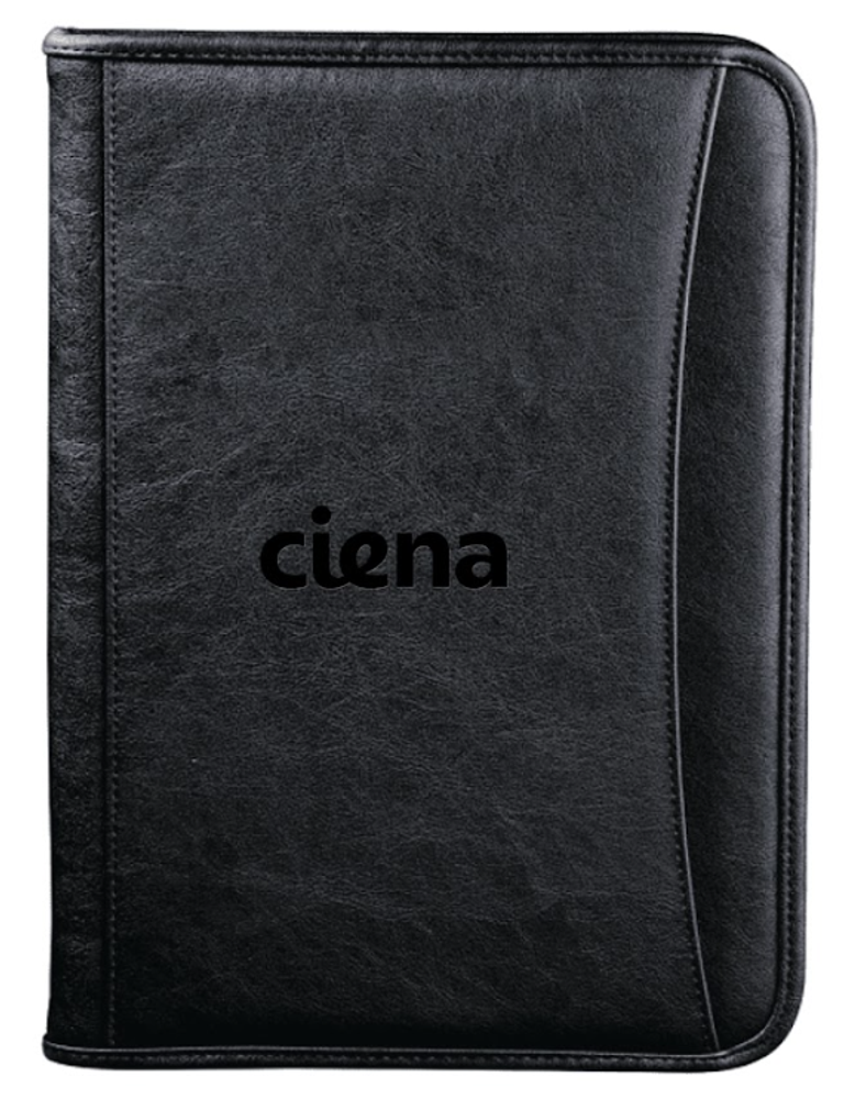 Zippered closure. Interior organizer with gusseted file pocket. Clear ID or calculator pocket. Front slot pocket. Includes 8.5" x 11" writing pad.