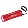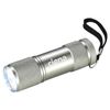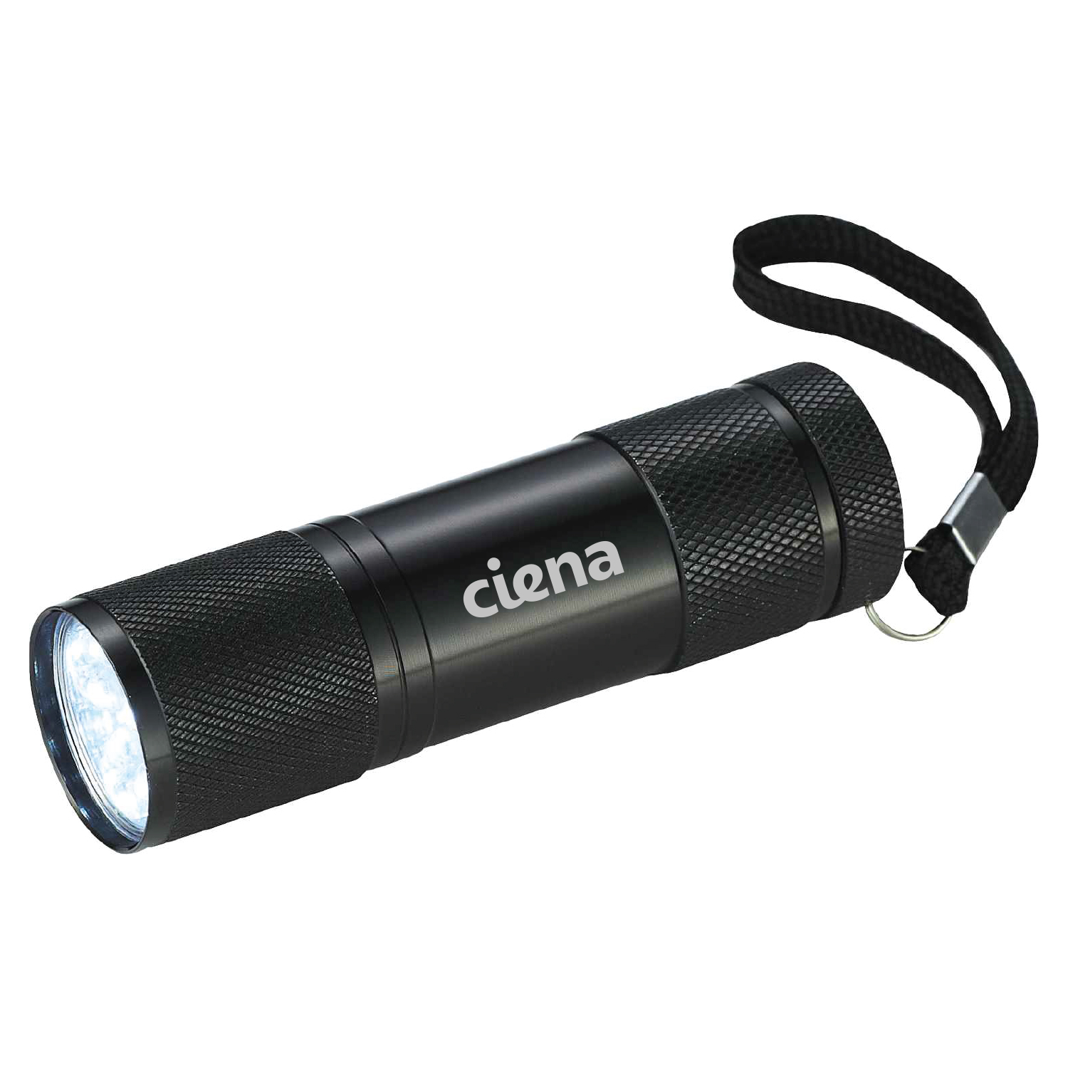 Push button on/off. 9 LED flashlight. Nylon carrying strap. 3 AAA batteries included.